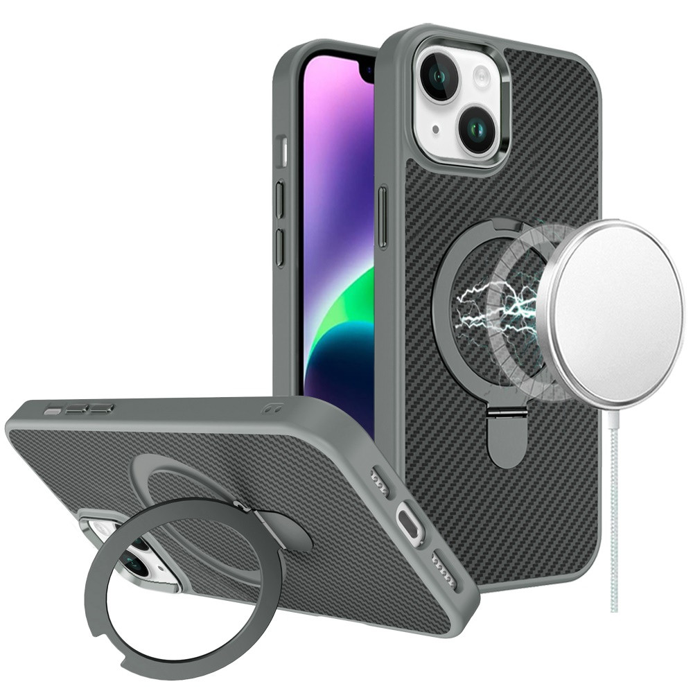 For iPhone 13/14 Carbon Design [Magnetic Circle] with Ring Stand Hybrid Case – Gray