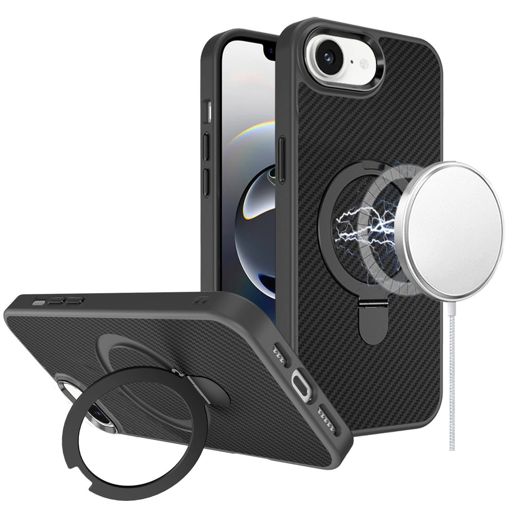 For iPhone 16E (E edition) / SE4 (2025) Carbon Design [Magnetic Circle] with Ring Stand Hybrid Case – Black