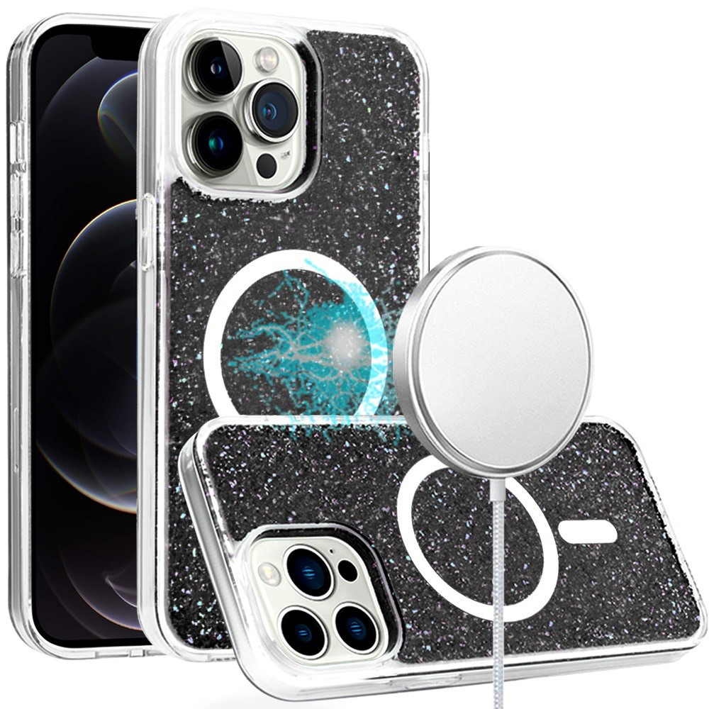 For iPhone 12 Pro Max 6.7 Epoxy Glitter [Magnetic Circle] ShockProof Hybrid 2.5mm Thick – Black