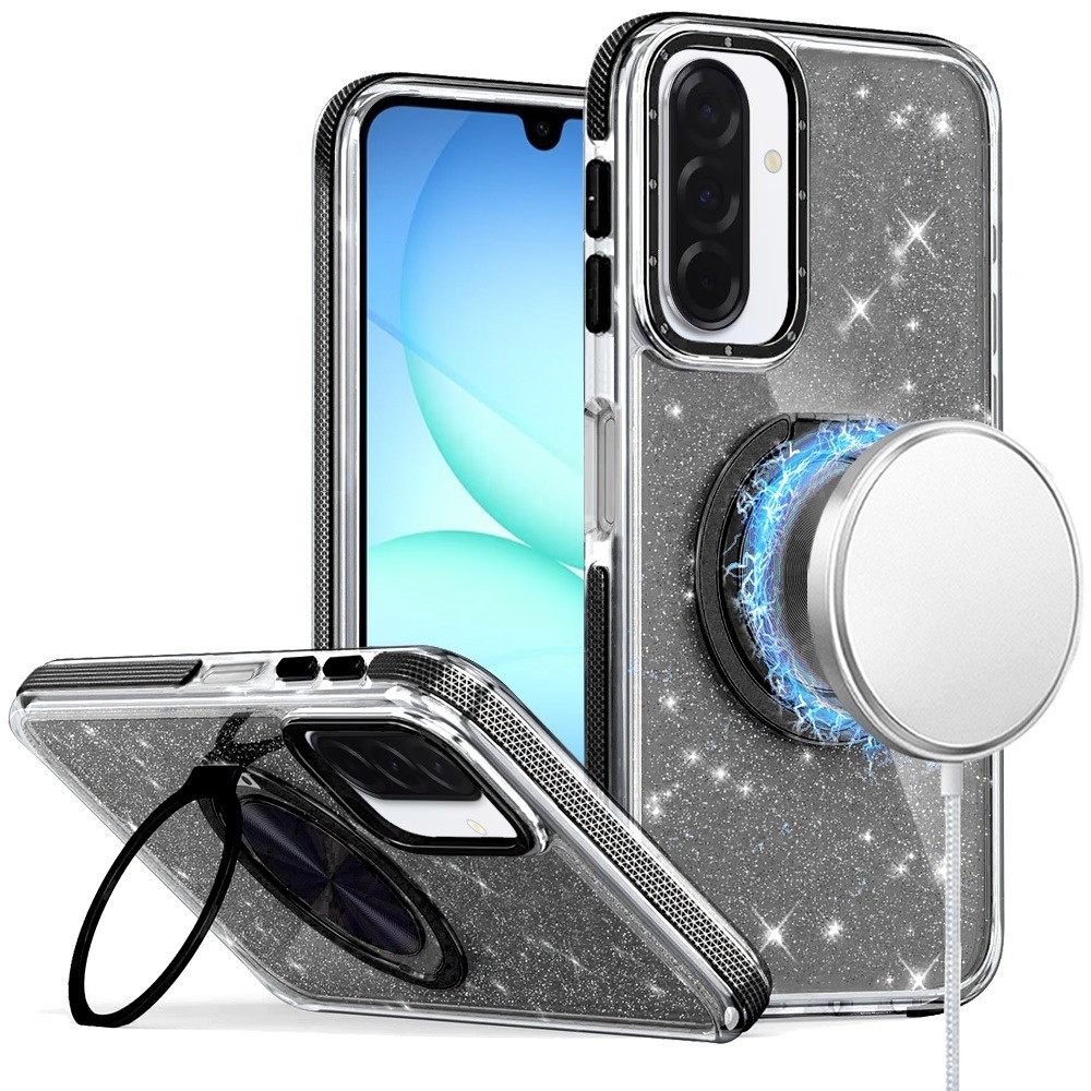 For Samsung A17 5G Glitz HQ Shimmer Glitter [Magnetic Ring Circle] with 360 degree Rotational Ring Kickstand Tough Hybrid Case – Black