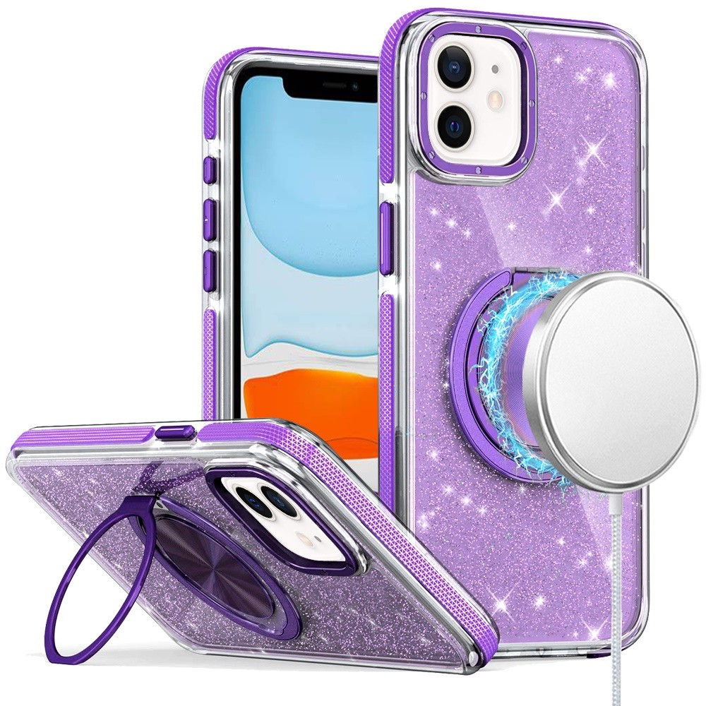 For iPhone 11 (XI6.1) Glitz HQ Shimmer Glitter [Magnetic Ring Circle] with 360 degree Rotational Ring Kickstand Tough Hybrid Case – Purple