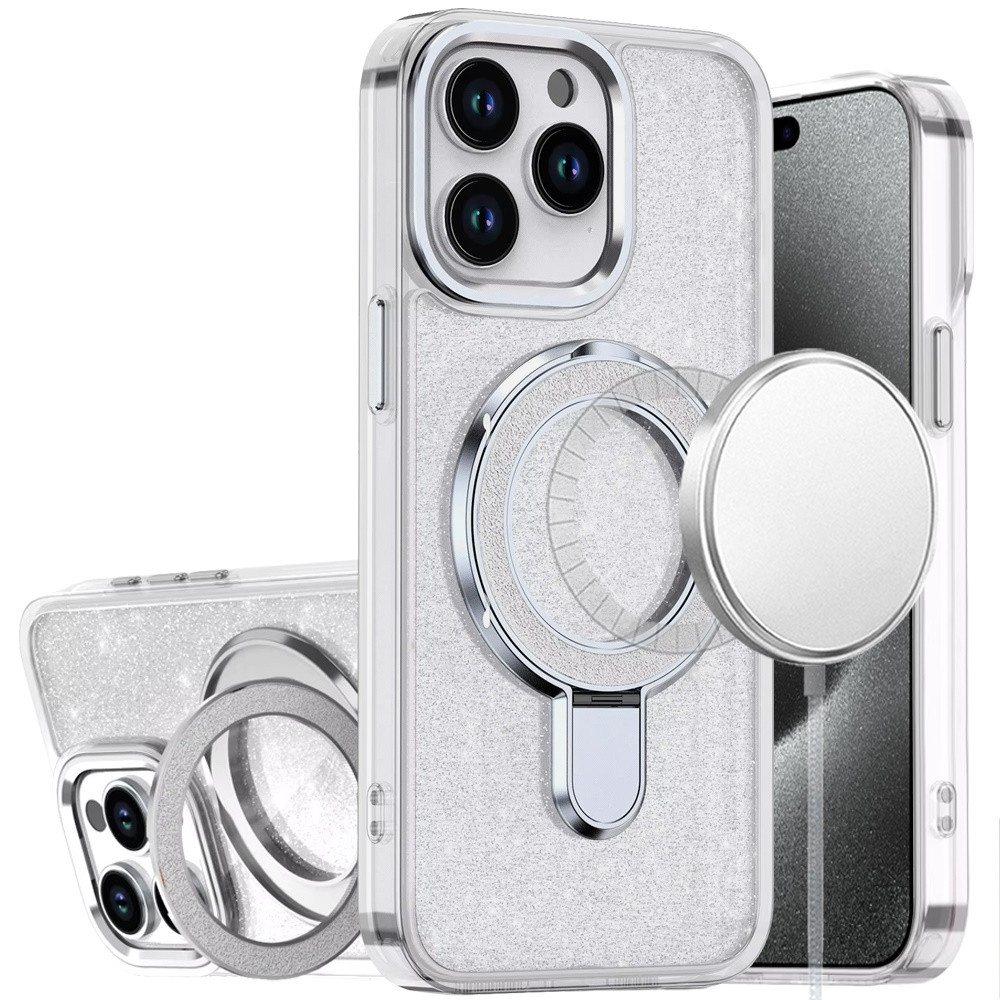 For iP15 Pro Max Transparent Glitter Rotaional Magnetic Ring Stand HQ Hybrid – Clear