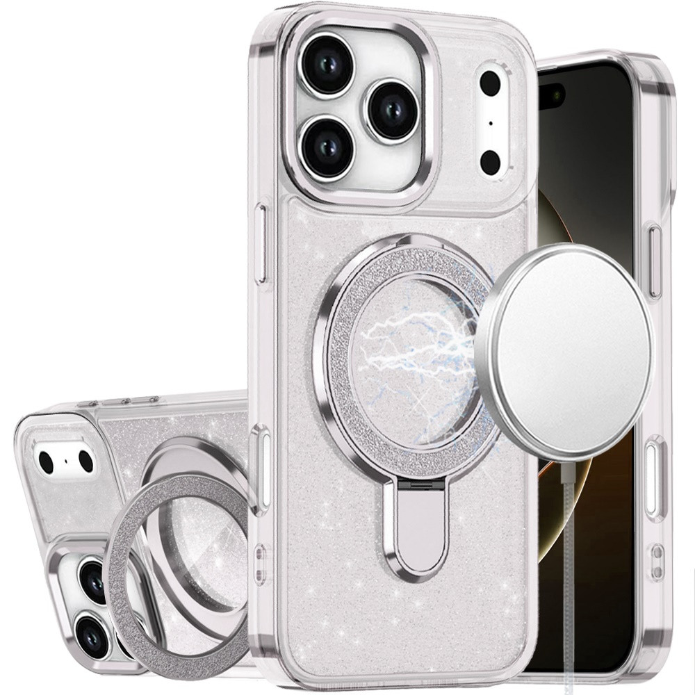 For iPhone 17 Pro Max Transparent Glitter Rotaional Magnetic Ring Stand HQ Hybrid – Clear