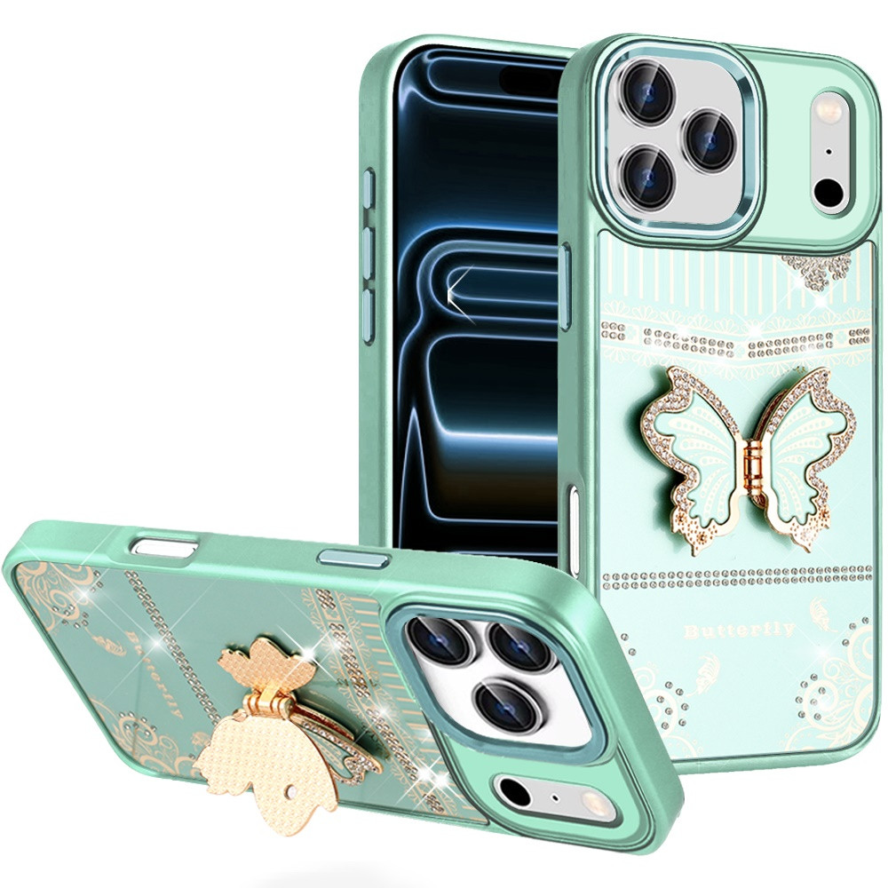 For iPhone 17 Pro Max Splendid Glitter Butterfly Design Stand with Metallic Edges Hybrid Case – Teal