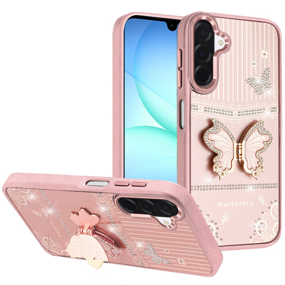 For Samsung A17 5G Splendid Glitter Butterfly Design Stand with Metallic Edges Hybrid Case – Rose Gold