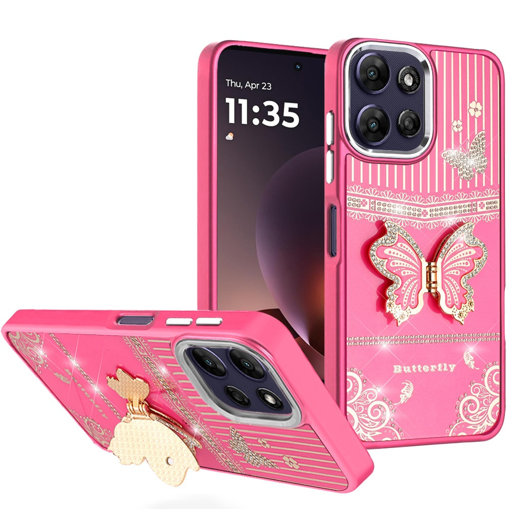 For Motorola Moto G Power 5G 2025 Splendid Glitter Butterfly Design Stand with Metallic Edges Hybrid Case – Hot Pink
