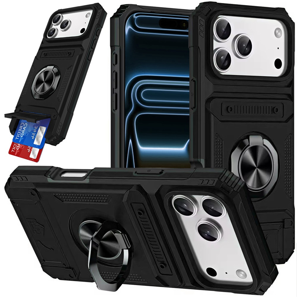 For iPhone 17 Pro Max Multi-Functional 2X Card Slot Shockproof Metal Ring Hybrid Case – Black