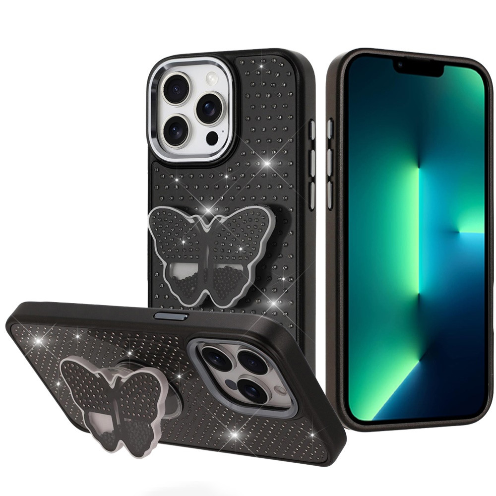For iPhone 13 Pro Max Butterfly Moveable Grip Stand With Small Diamonds Meta Buttons HQ Hybrid – Black