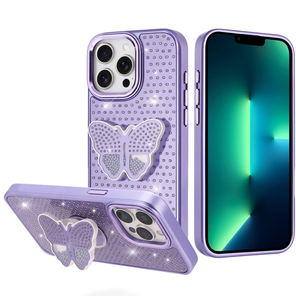 For iPhone 13 Pro Max Butterfly Moveable Grip Stand With Small Diamonds Meta Buttons HQ Hybrid – Purple