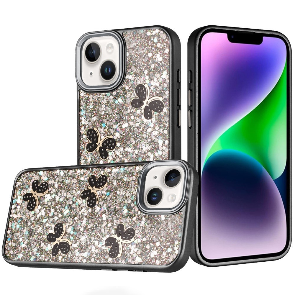 For iPhone 13/14 Cute Butterfly Ornaments Diamonds Shimmer Matching Metallic HQ Hybrid – Black