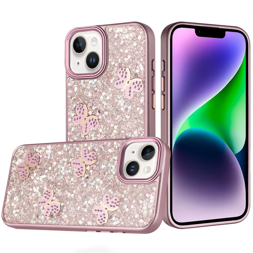 For iPhone 13/14 Cute Butterfly Ornaments Diamonds Shimmer Matching Metallic HQ Hybrid – Pink