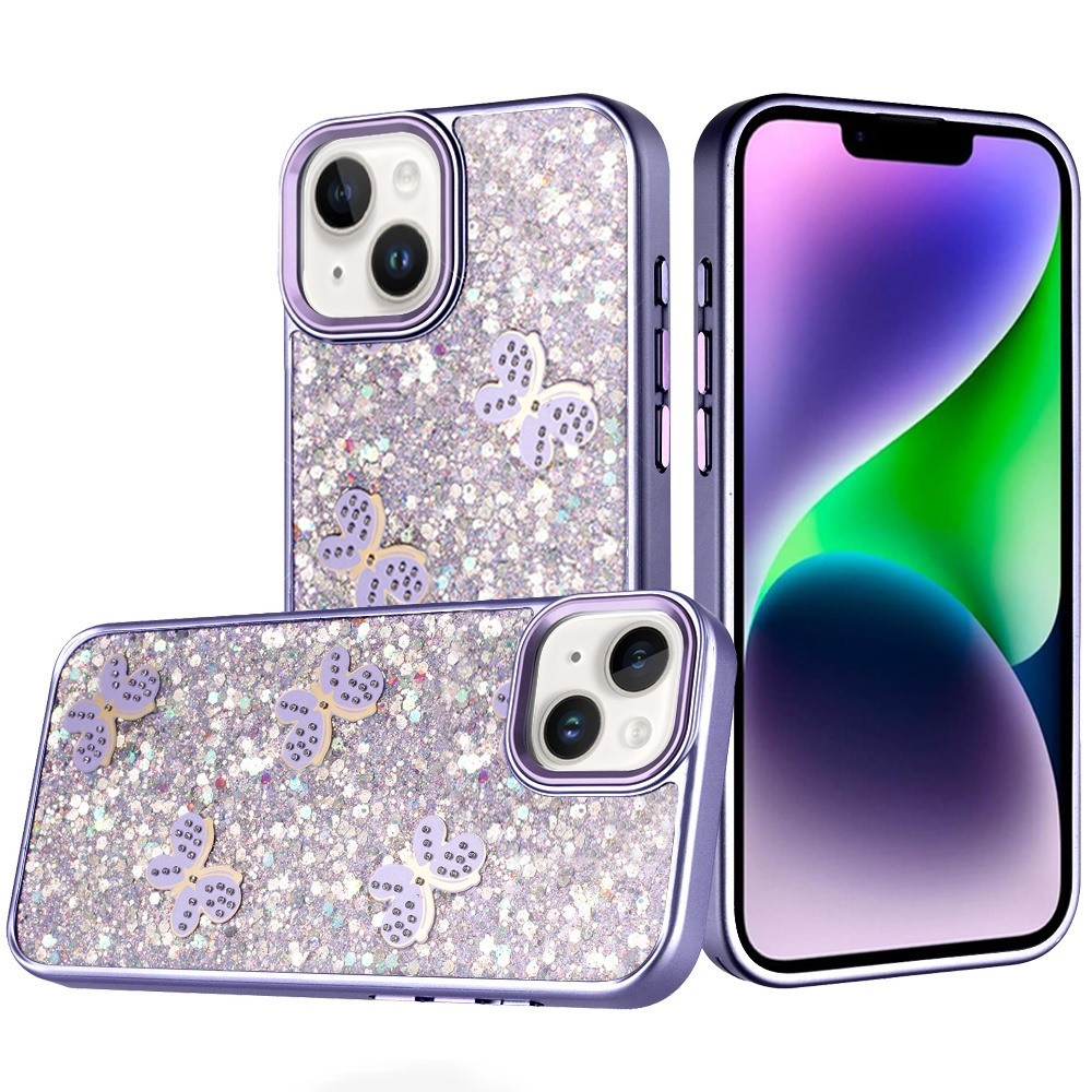 For iPhone 13/14 Cute Butterfly Ornaments Diamonds Shimmer Matching Metallic HQ Hybrid – Dark Purple