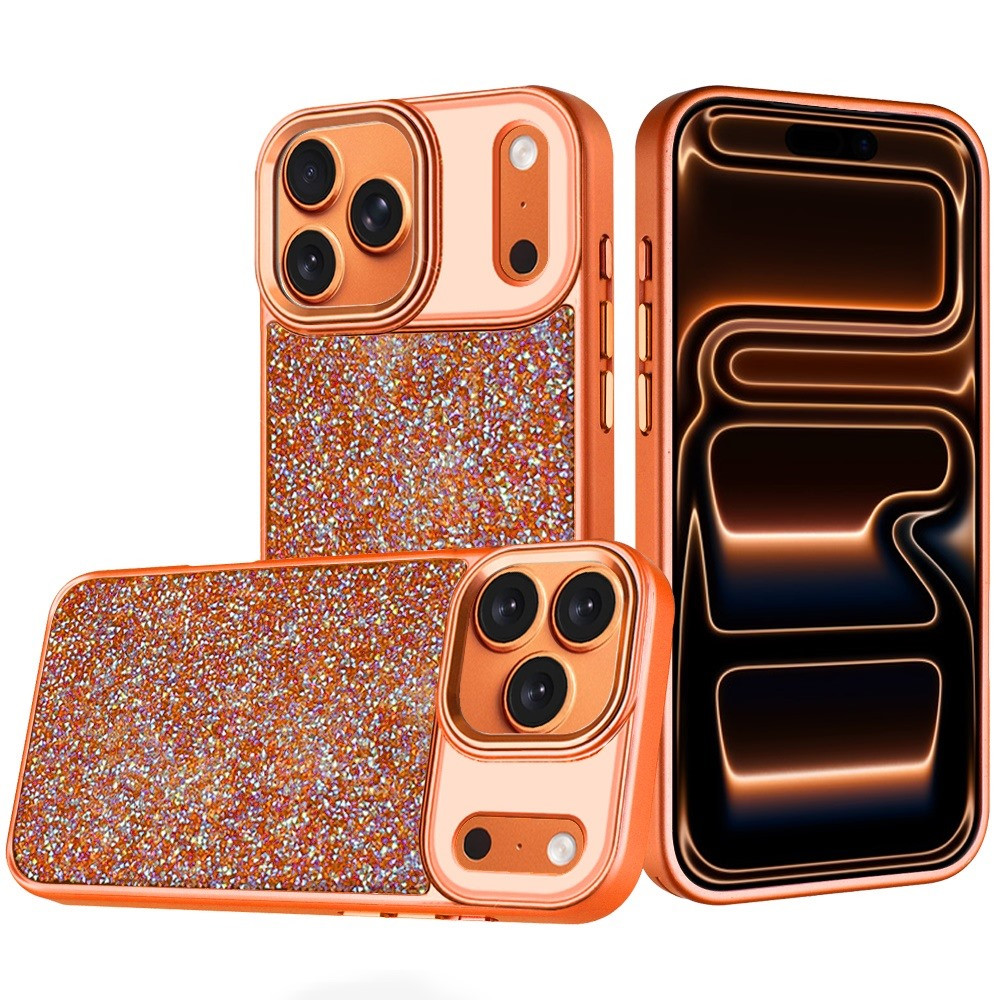 For iPhone 17 Pro Crystal Glass Diamond with Metallic Buttons and Edges Hybrid Case – Cosmic Orange
