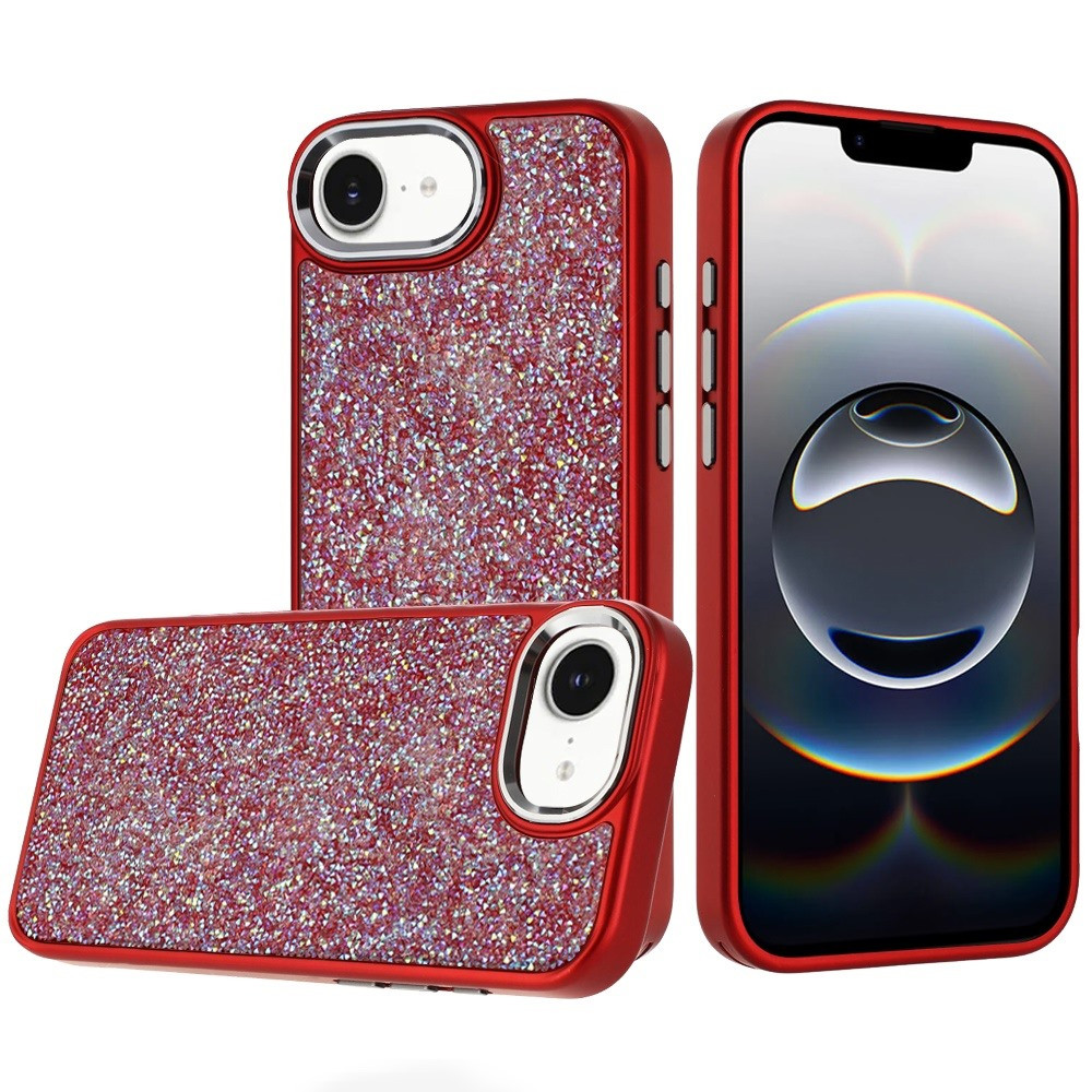 For iPhone 16E (E edition) / SE4 (2025) Crystal Glass Diamond with Metallic Buttons and Edges Hybrid Case – Red