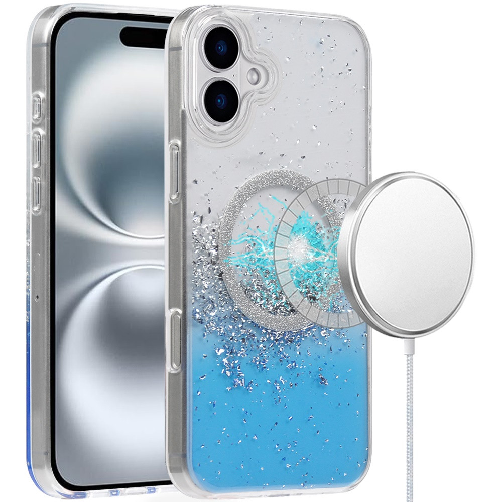 For iPhone 16 Plus 6.7 inch Magnetic Glitter Epoxy Transparent Hybrid – Blue