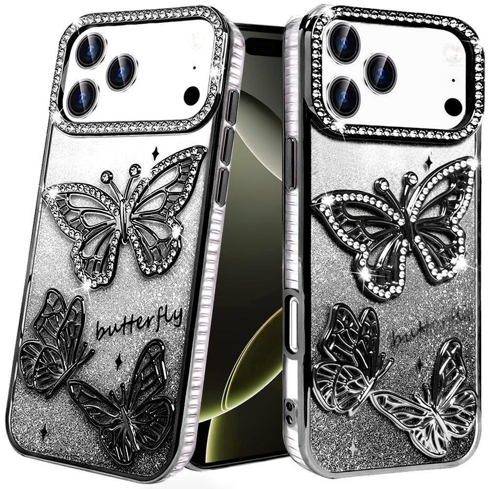 For iPhone 17 Pro Butterfly Freedom Shimmer Glitter Thick TPU Case Cover – Black