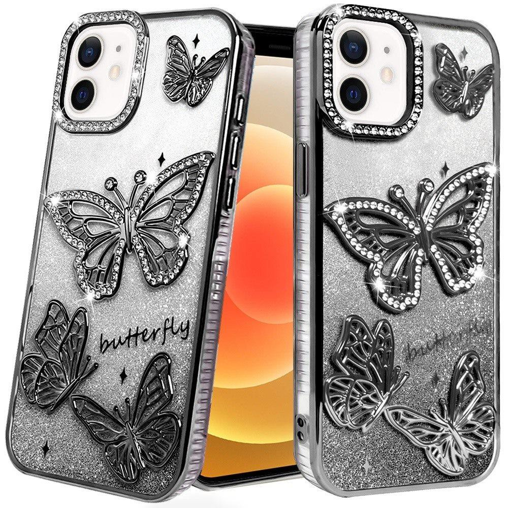 For iPhone 12 & iPhone 12 Pro Butterfly Freedom Shimmer Glitter Thick TPU Case Cover – Black