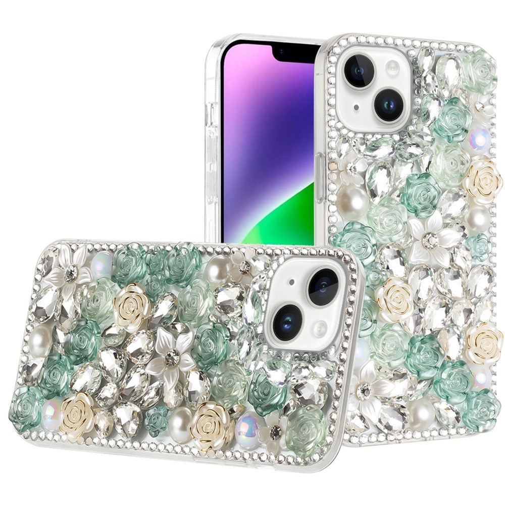 For iPhone 14 6.1″” Rose Flower Full Diamond Bling Stones – Green