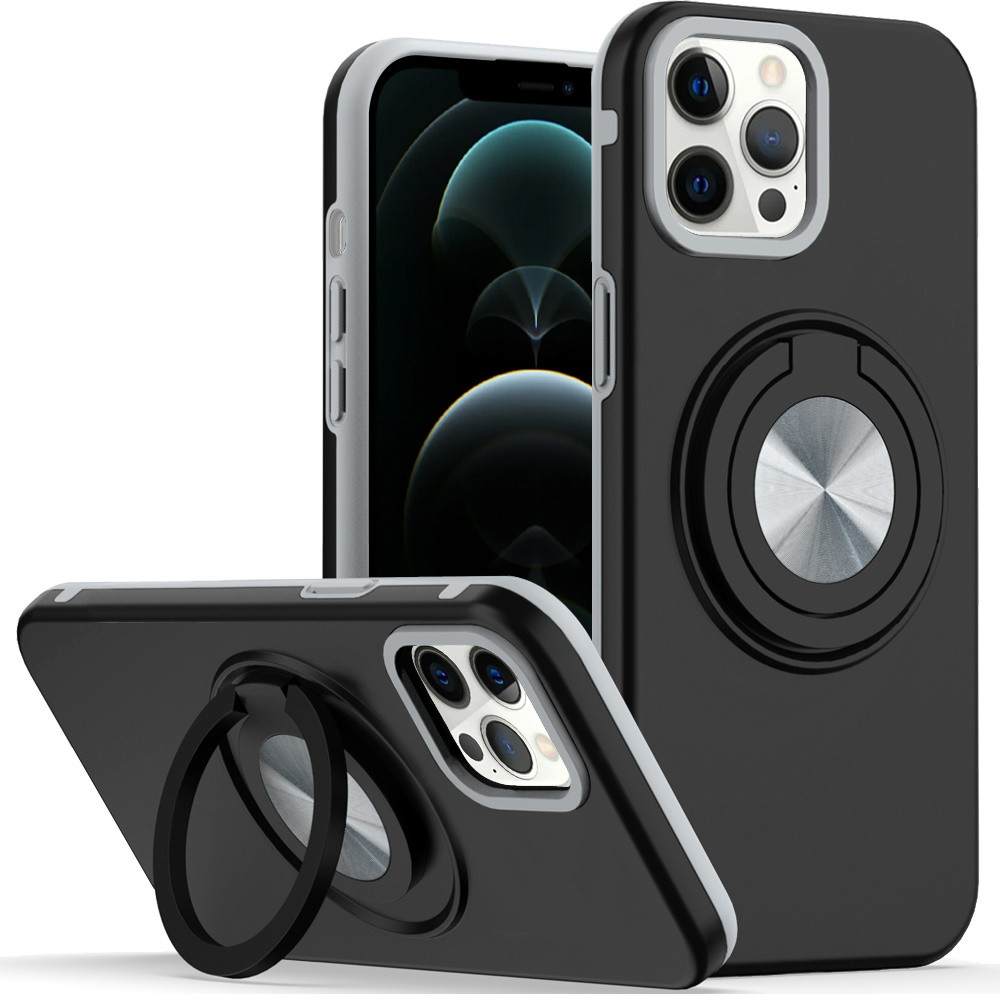 For iPhone 12 Pro Max 6.7 Metal CD Pattern Matte Finished Hybrid with Rotational Ring [Car Mount Friendly] Case – Black