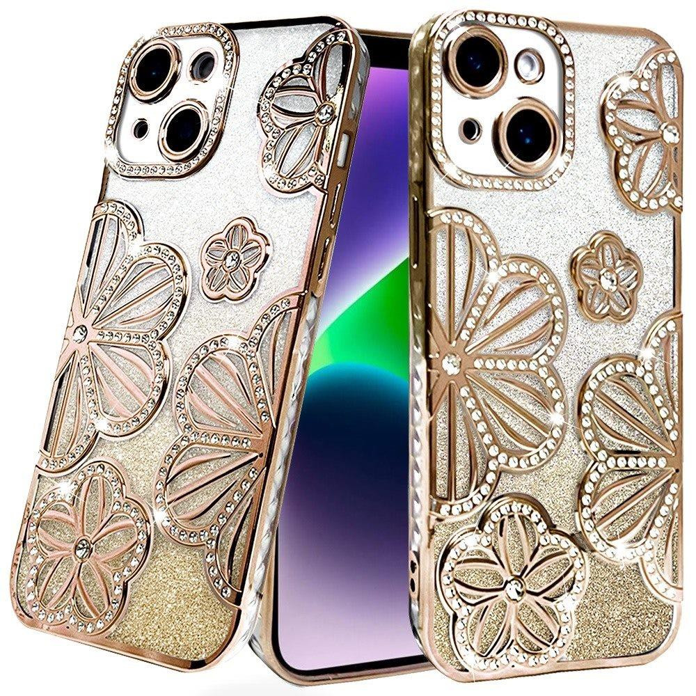 For iPhone 13/14 Shimmer Glitter Floral Design Thick TPU Case Cover – Gold