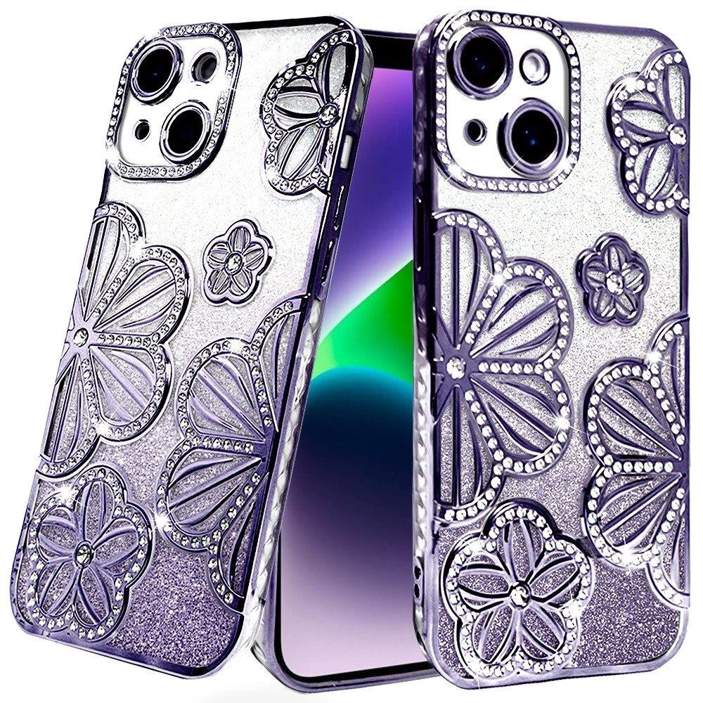 For iPhone 13/14 Shimmer Glitter Floral Design Thick TPU Case Cover – Purple