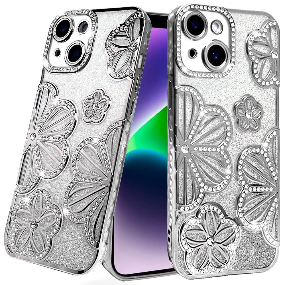 For iPhone 13/14 Shimmer Glitter Floral Design Thick TPU Case Cover – Silver