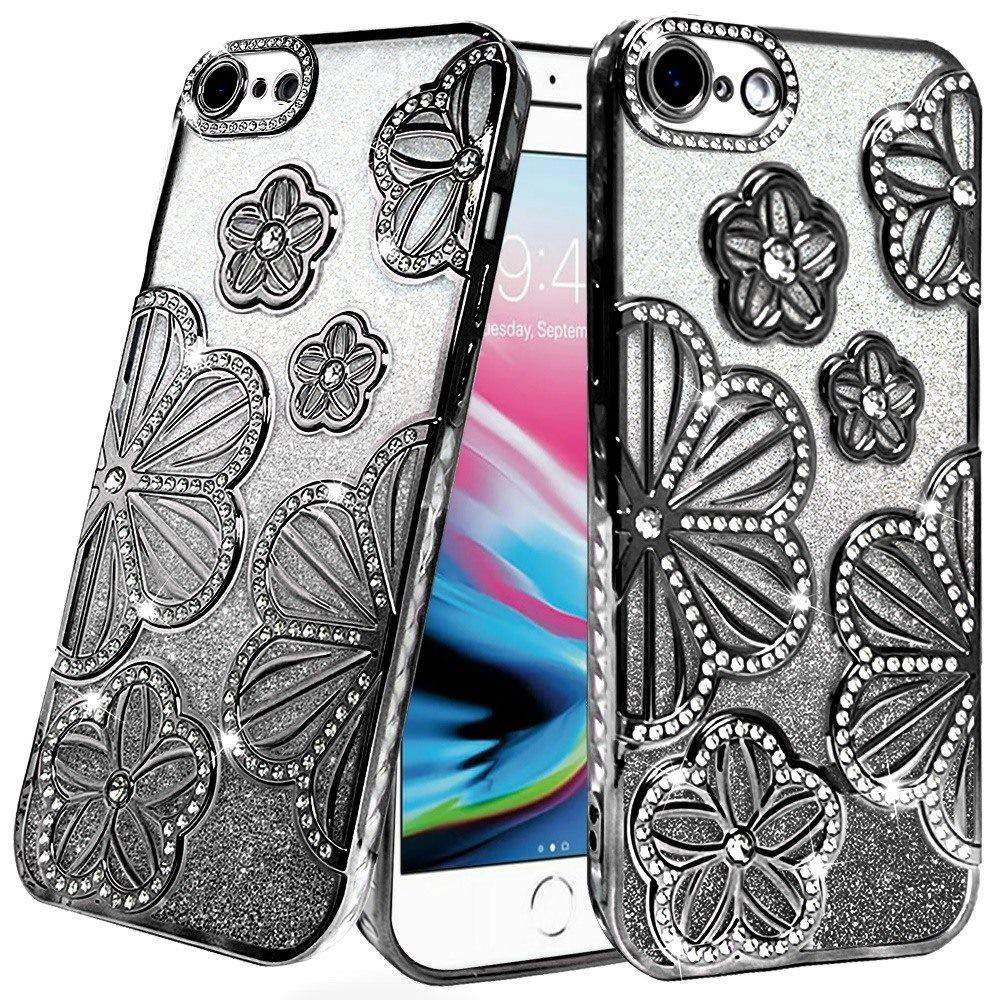For iPhone SE 3 (2022) SE/8/7 Shimmer Glitter Floral Design Thick TPU Case Cover – Black