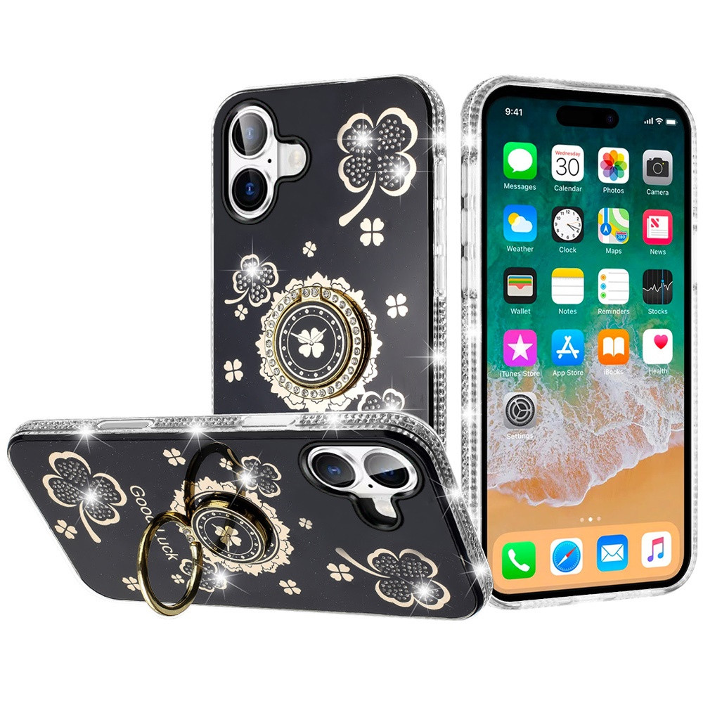 For iPhone 16 Plus 6.7 inch Splendid Glitter with Diamonds All Around Edges Ring Stand Case Cover – Black