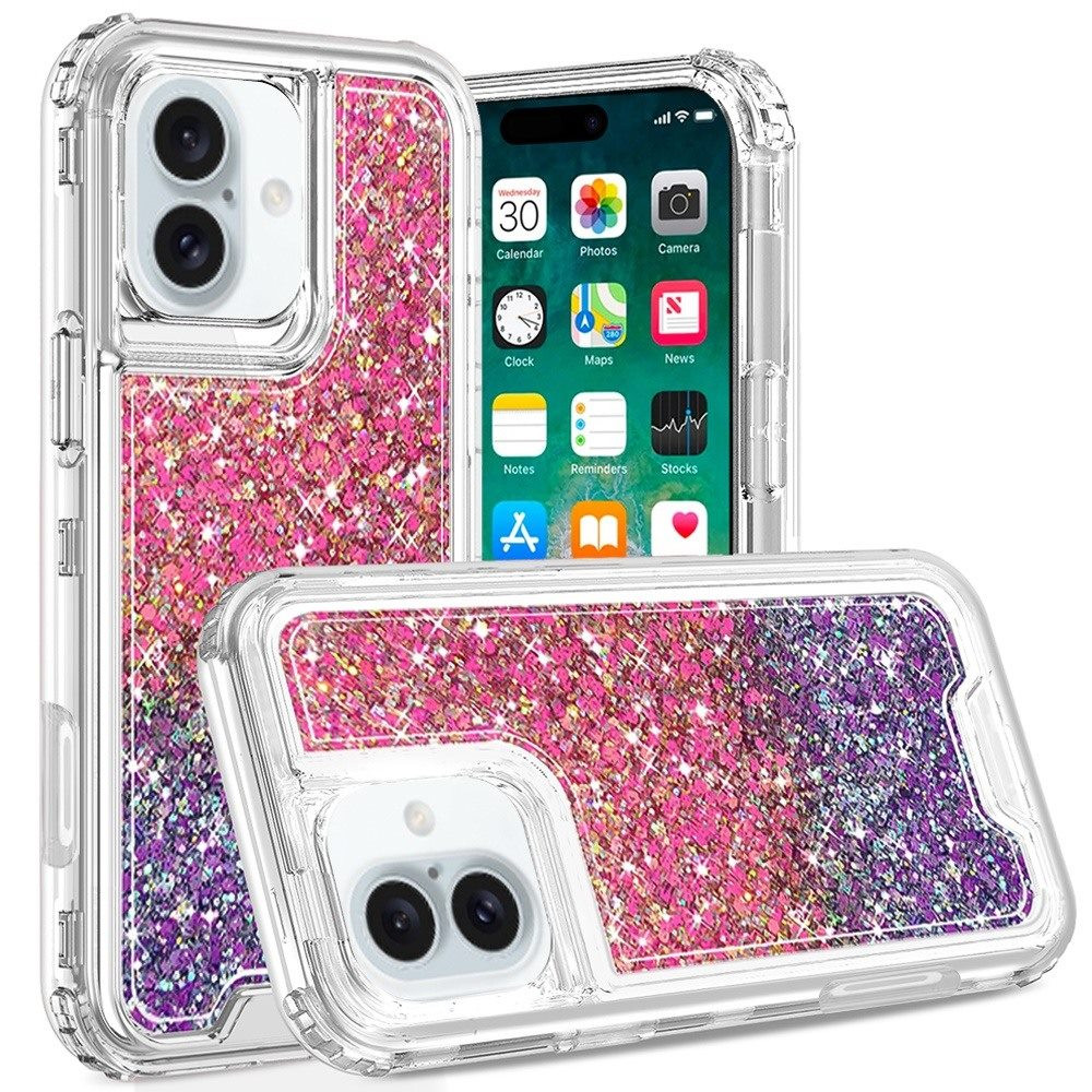 For iPhone 16 Plus 6.7 inch Epoxy Sticker Glitter 3in1 Shockproof Transparent Hybrid Case – Hot Pink + Purple