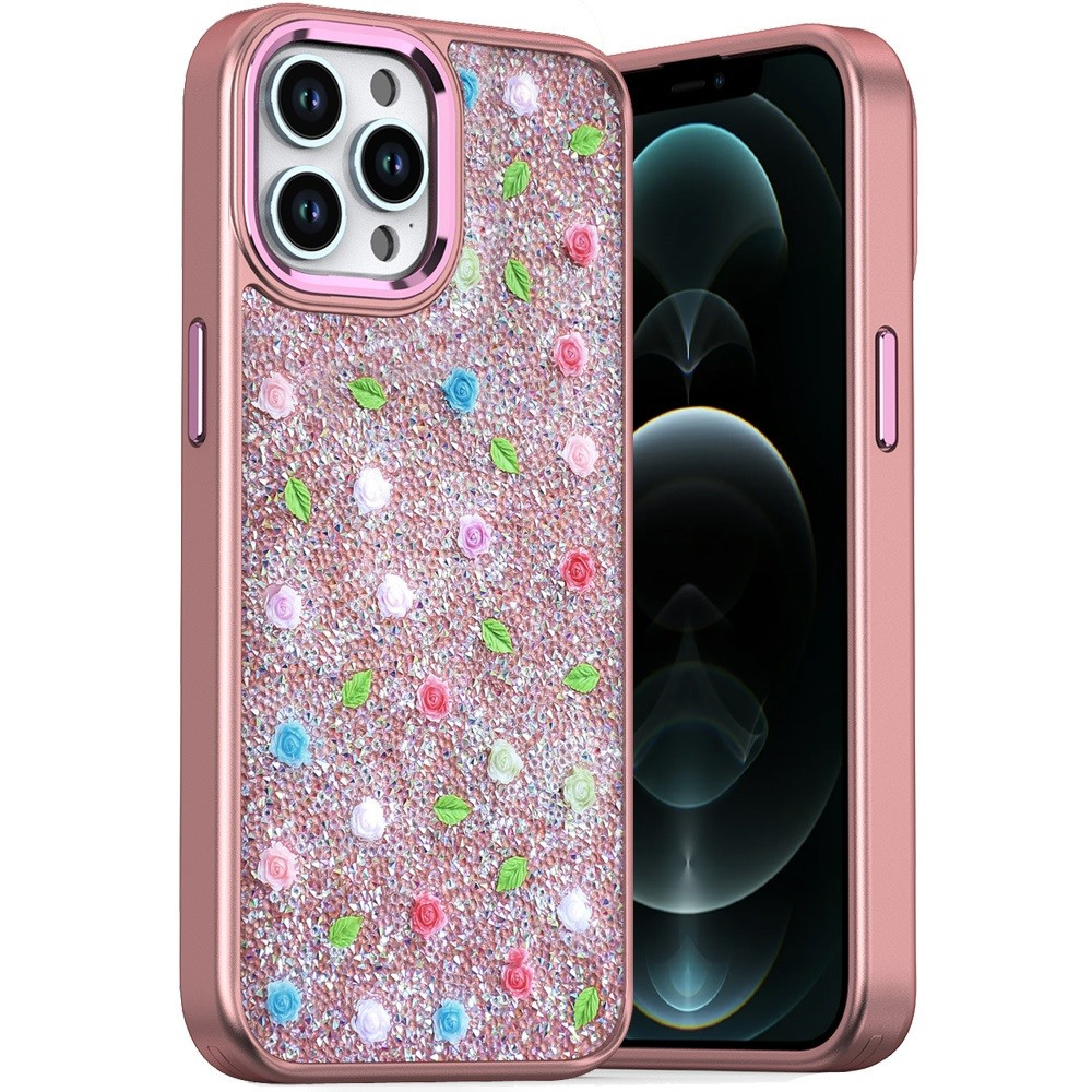 For iPhone 12 Pro Max 6.7 Stick-On Embedded Glass Diamonds of Colorful Floral Arrangement HQ Hybrid Case – Rose Gold