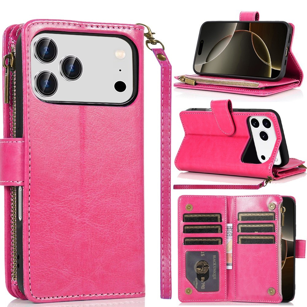 For iPhone 17 Pro Luxury Wallet Card ID Zipper Money Holder Case Cover – Hot Pink